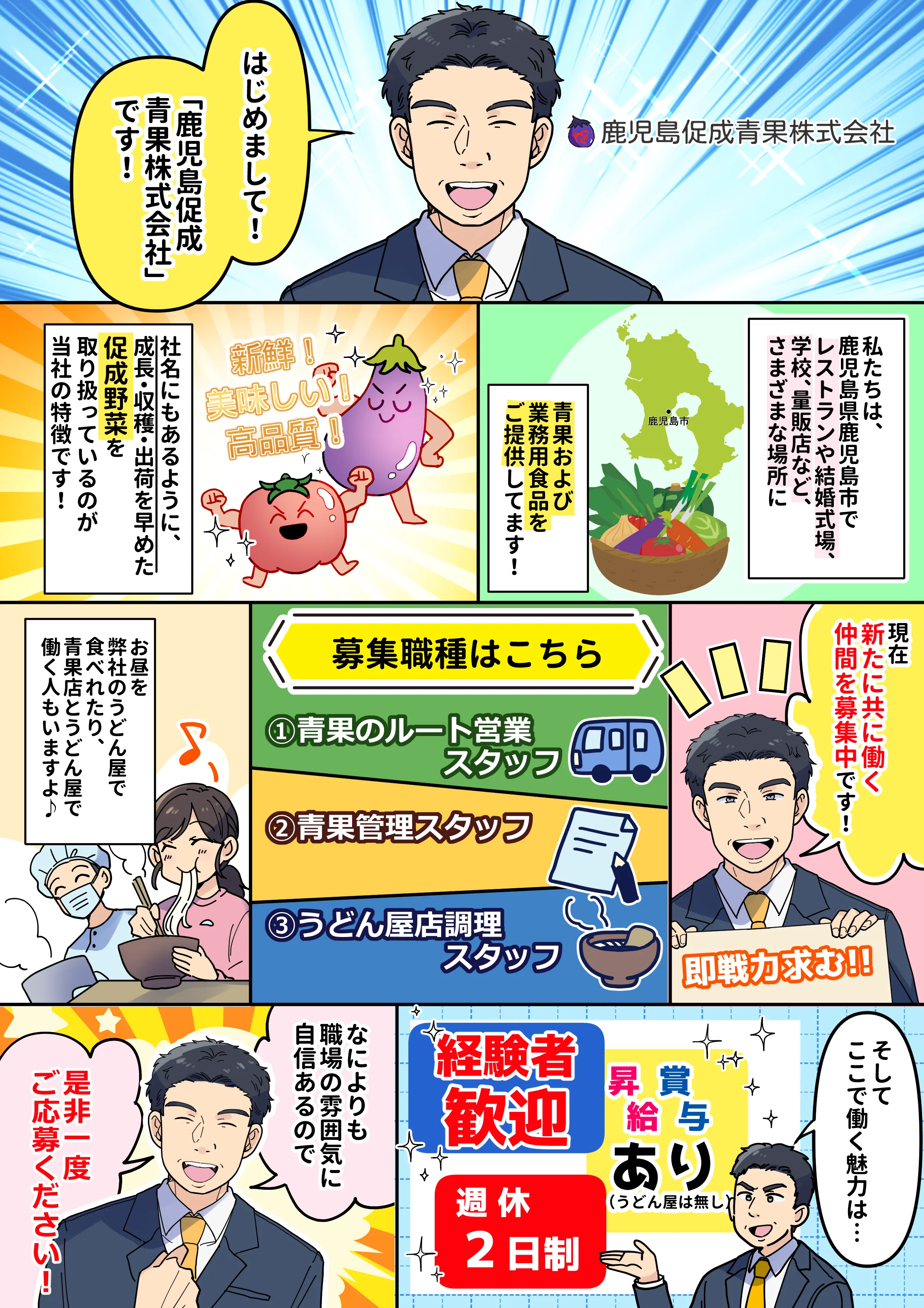 この度、業務拡大につき、ルート営業職、青果管理職、調理員(うどん店)の求人を募集しています。